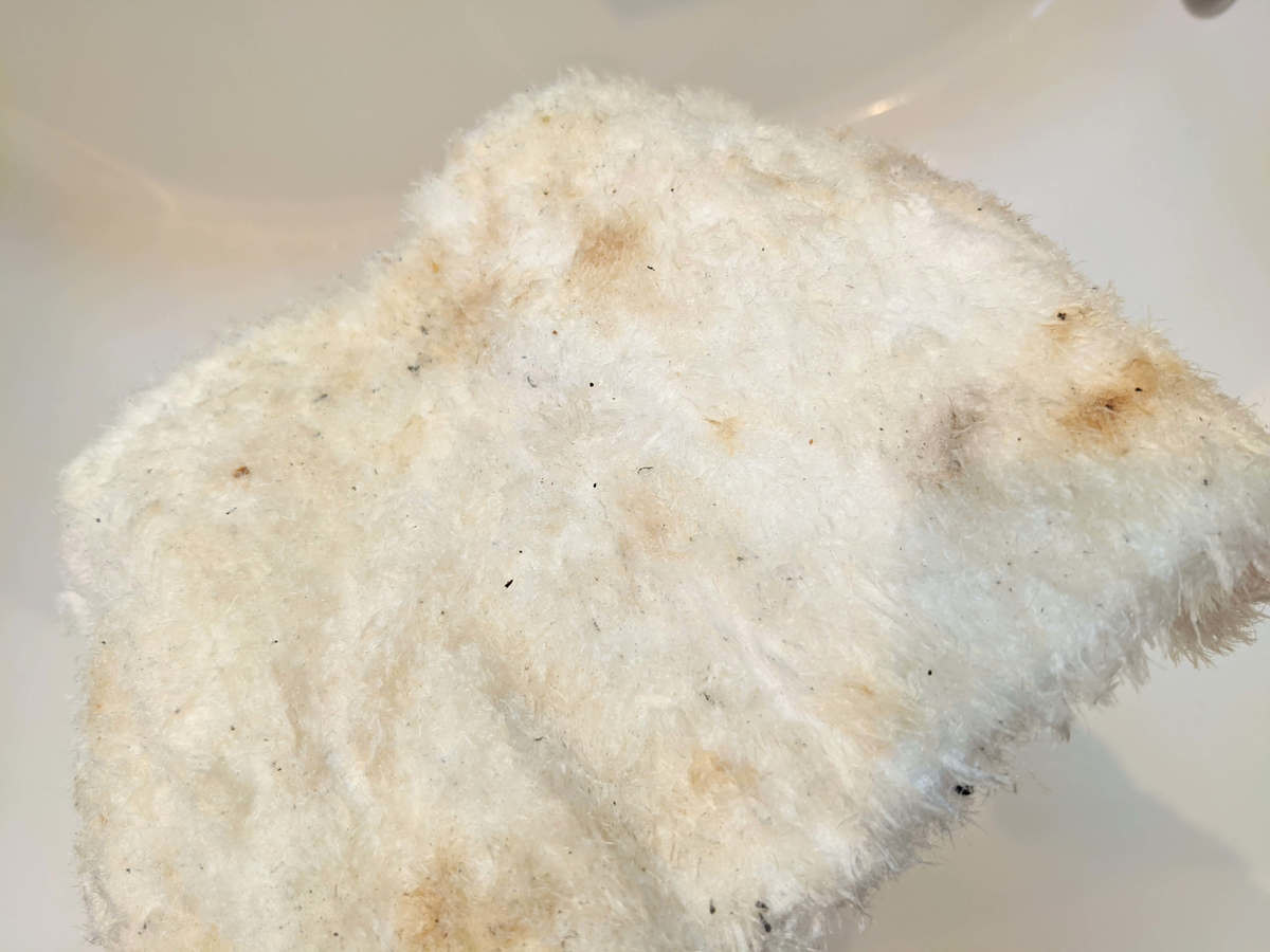 ぞうきんは真っ黒にはなりませんでしたが、油汚れなので触るとベタベタ……。 普通のぞうきんであれば、漂白剤などでつけ置きしないとキレイにならない汚れ具合です。