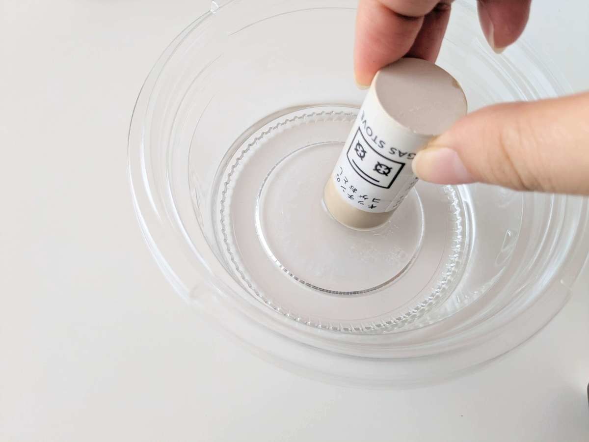 まず、コゲおとしの先端(5mm~1cmくらい)を水に約1~2秒程度つけます。 長く水に浸していると、柔らかくなりすぎて溶けてしまうため、5秒以上は浸さないようにしましょう。