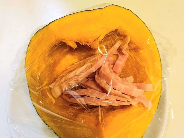 ①南瓜は皮を下にして、ラップの上におき、ベーコンを乗せてふんわり包む。