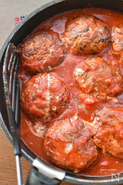 ふんわり柔らかい豆腐ハンバーグをトマトで煮込んだ、旨味たっぷりな煮込みハンバーグです。豆腐は水切り不要でとってもお手軽。お子様ウケもバッチリな一品です。