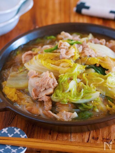 材料を重ねて煮込むだけのお手軽メニューです。お肉の旨味を吸った白菜はとろ〜り絶品、春雨のちゅるんとした食感もたまりません。15分ほどで作れるお手軽さも嬉しいポイントです。