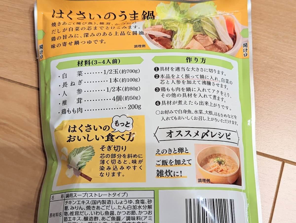 鍋つゆの裏面を見るとこのように、メーカーおすすめの具材と〆レシピが書かれています。