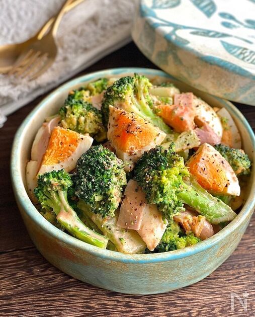 ブロッコリー×ゆで卵×ハムを組み合わせて、オーロラソースでまとめた作り置きサラダ。旨みたっぷりのデリ風で、あともう一品やお弁当に重宝します。冷蔵で2日ほど保存可能。