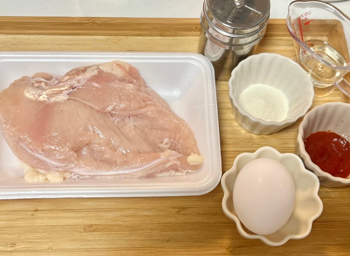 お好みでケチャップをかけたら、"鶏むね肉のたたき焼き"の完成です!