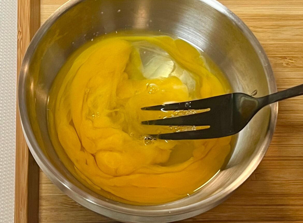 ボウルに卵を入れてよく溶き、塩少々で味付けします。フォークを使ってかき混ぜると、素早く溶き卵を作ることができますよ♪