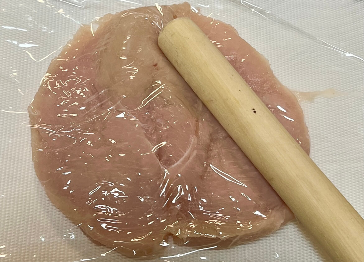 鶏むね肉をやわらかくするため、叩いて広げていきます。私は麺棒を使って叩きました♪