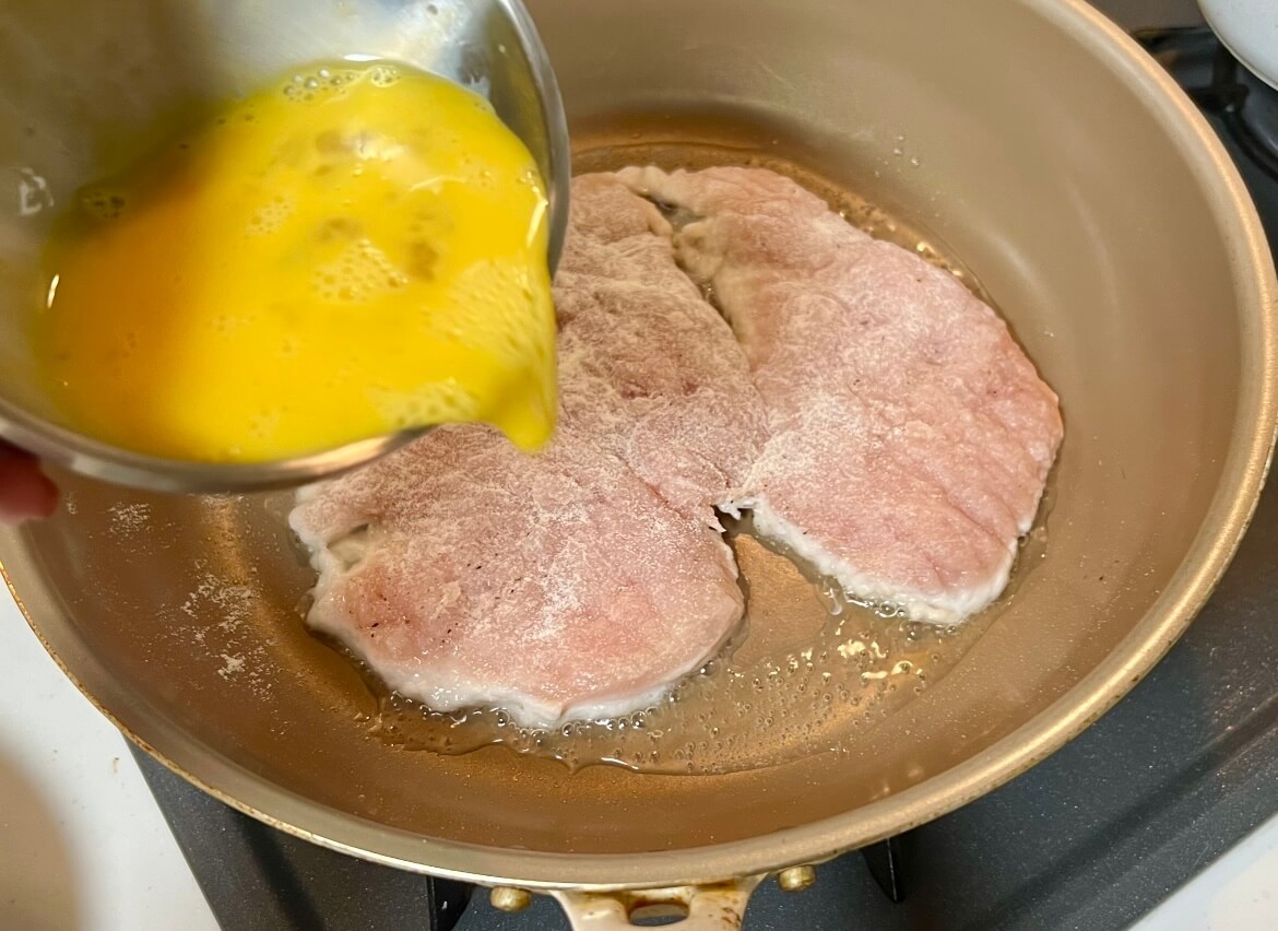 鶏むね肉レシピ③フライパンに入れ、周りに卵液を流し込む