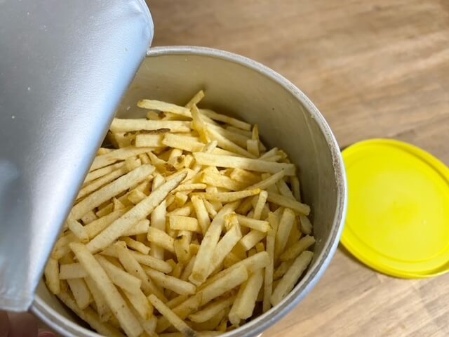 蓋をあけると驚くほどぎっしり入っていて、入れものを傾けてもポテトスティック同士が絡み合い落ちてきません。
