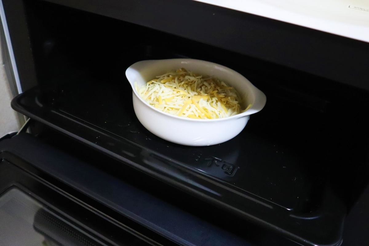 (3)耐熱皿に中身を移し、ピザ用チーズをかけて、トースター(1000W)で8分ほど、こんがりと焼きます。