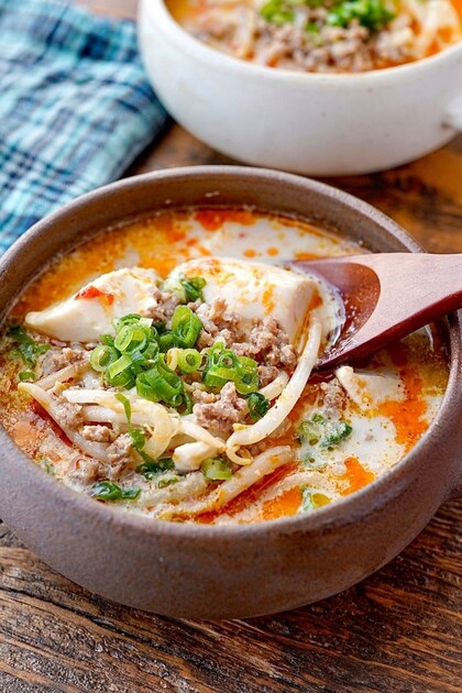 包丁もまな板も不要!豆腐やもやしで満腹感もあり、ピリ辛な味付けに満足感も申し分なしです。豆乳のおかげでまろやかな辛さになるので、辛いのが苦手な方も美味しくいただけますよ。豆乳は沸騰させると分離するので沸騰直前で火を止めましょう。