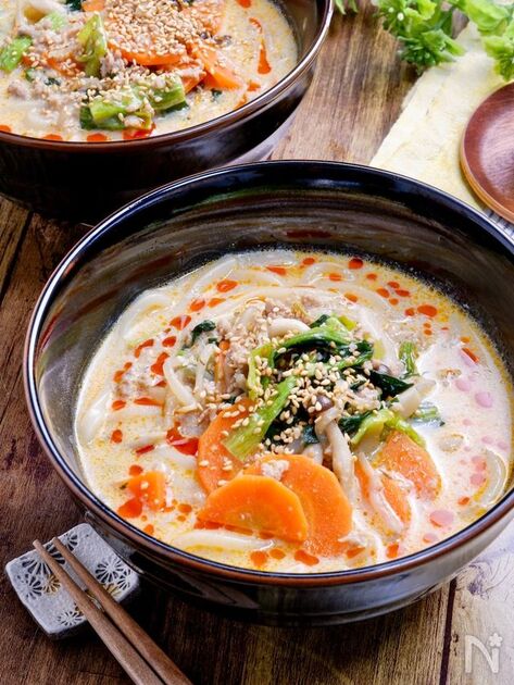 お肉と野菜がたくさん入った坦々麺風のうどんレシピ。おいしく食べながら栄養もしっかり摂ることができます。食べ応え満点で旨みたっぷり。昼食はもちろん、夕食にもおすすめです。